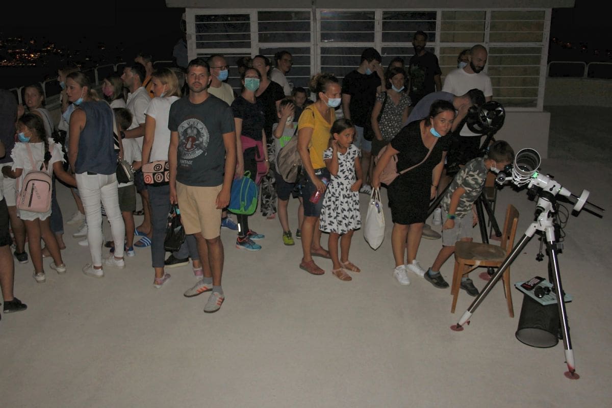 Nakon predavanja se pristupilo lovu na meteore iz roja Perzeida, ali i promatranju Mjeseca i planeta s terase zvjezdanice. Većina posjetitelja se bila okupila oko zvjezdarnice. Njih je s najzanimljivijim objektima vidljivima na nebeskom svodu upoznao gost iz Zagreba Ante Radonić, stručni suradnik popularne radijske emisije „Andromede“. Zbog važećih epidemioloških mjera, posjetitelji su izlazili na terasu u manjim skupinama. Za njih su tamo bila postavljena tri teleskopa kroz koja su mogli baciti pogled na Mjesečev srp i planete Jupiter i Saturn. Taj dio promatranja je vodio astronom-animator Udruge Zoran Knez, uz dragocjenu pomoć njenih mladih članova, studenata splitskog PMF-a.