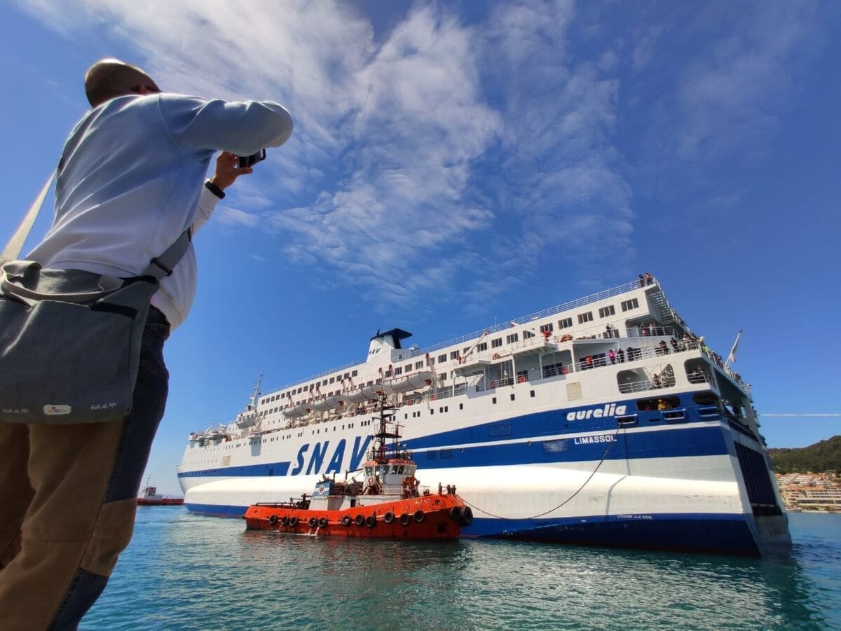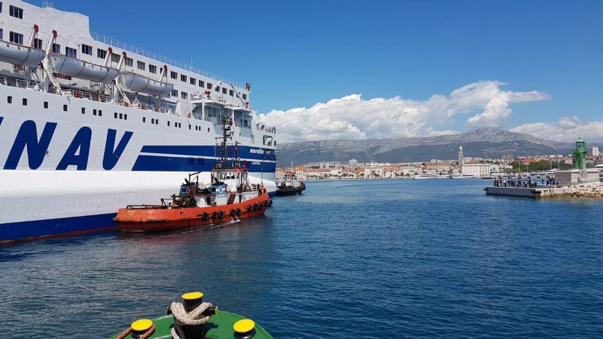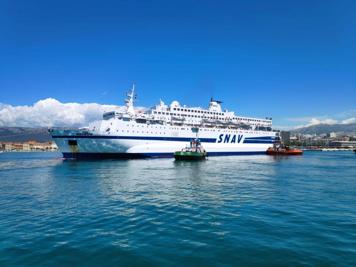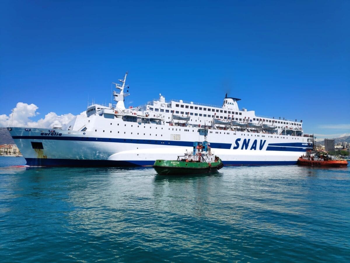 Feribot talijanske brodarske kompanije SNAV “Aurelia”; koji plovi na liniji Ancona-Split, sredinom dana se nalazi pred samim gradom nakon cjelodnevne drame na otvorenom moru, gdje je tegljenje otežavalo jako jugo. U ranim popodnevnim satima konačno je uplovio u splitsku gradsku luku.