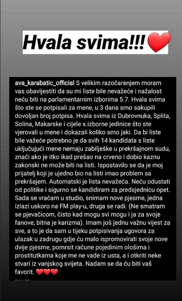 "S velikim razočaranjem vas moram obavijestiti da su mi liste bile nevažeće i nažalost neću biti na parlamentarnim izborima 5. 7. Hvala svima što ste se potpisali za mene, u tri dana smo skupili dovoljan broj potpisa", napisala je Karabatić u podužoj objavi, a pojasnila je i zbog čega su liste bile nevažeće. "Da bi liste bile važeće potrebno je da svih 14 kandidata s liste uključujući mene nemaju zabilješke na prekršajnom sudu, znači ako je itko ikad prešao na crveno i dobio kaznu zakonski ne može biti na listi. Ispostavilo se da je moj prijatelj koji je ujedno bio na listi imao problem s prekršajem. Automatski je lista nevažeća", dodala je, najavljujući da će se sigurno kandidirati na sljedećim predsjedničkim izborima. Sada se namjerava vratiti u studio i posvetiti snimanju pjesama.
