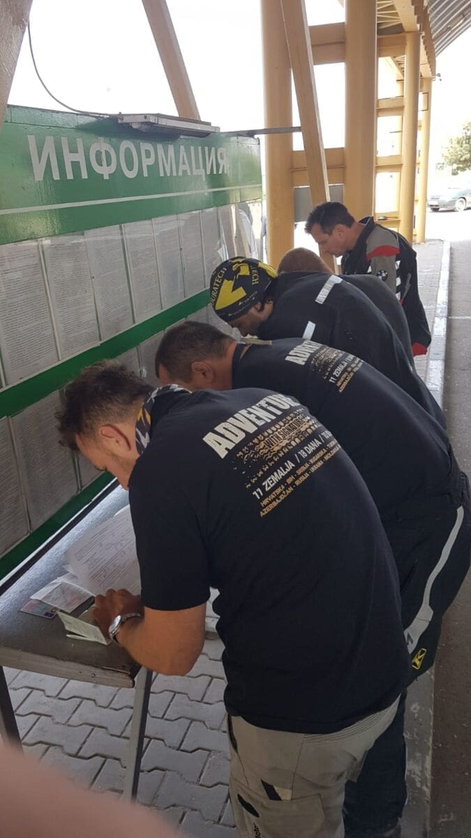 Dolazimo na rusku granicu: prvo dvojica otvore vrata i puštaju jednog po jednog, zatim ti daju jedan papir da ga ispuniš, kad ga ispuniš onda još jedan takav. Nakon toga u sljedeću sobu gdje ti daju jedan papir koji treba ispisati i to u dva primjerka, i još jedan samo u jedan primjerak. Nakon toga pretres, pa ponovno šalter 3, zatim još jedna provjera i napokon nakon 3 sata prolazimo granicu, pravac Mahackala.