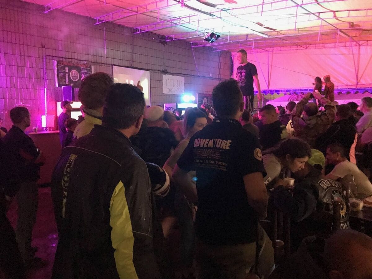 Samo 30 km prije cilja počinje kiša, točnije pljusak. Hvata nas mrak, ne vidimo rupe. Svi pogađamo rupe tako jako da su nam se retrovizori odvidali, jednostavno je nemoguće kako nisu popucali amortizeri! Potpuno mokri se prijavljujemo za ulazak na party, plaćamo ulaz 20 € i vozimo kroz šumu punu blata. Parkiramo motore i odemo do prvog šatora. Popijemo pivo, pojedemo neke kobasice i odlučimo naći hotel jer smo potpuno iscrpljeni od cijelog današnjeg dana.