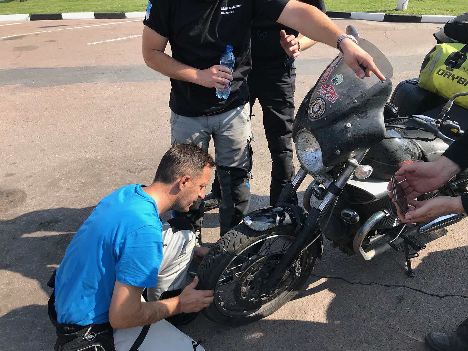 Uz kontrolu i pretres dolazimo do zadnjeg punkta na ruskoj granici i taman da ću čestitati ekipi kako smo lako pregazili Rusiju, Marasović mi kaže da se Mustapiću na Moto Guzziju probila prednja guma. Odmah vadim kompresor i pumpamo gumu dok traje pretres i shvatimo da mu guma pušta na ventilu.