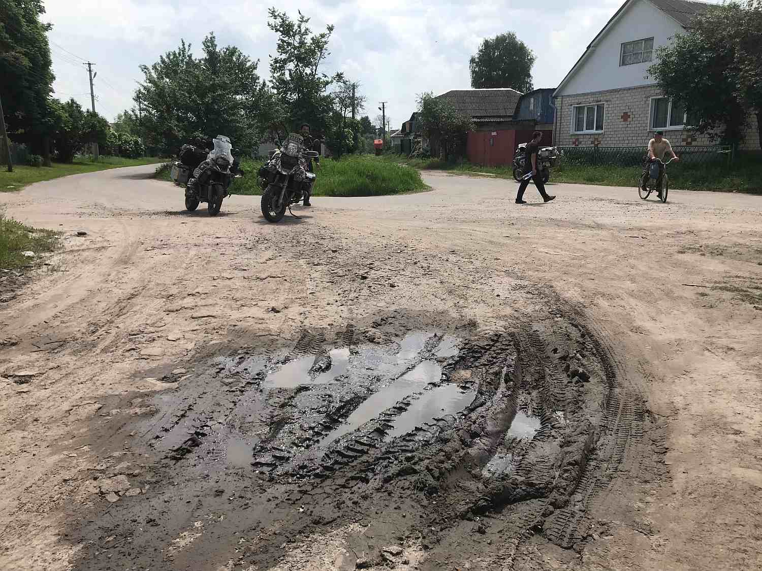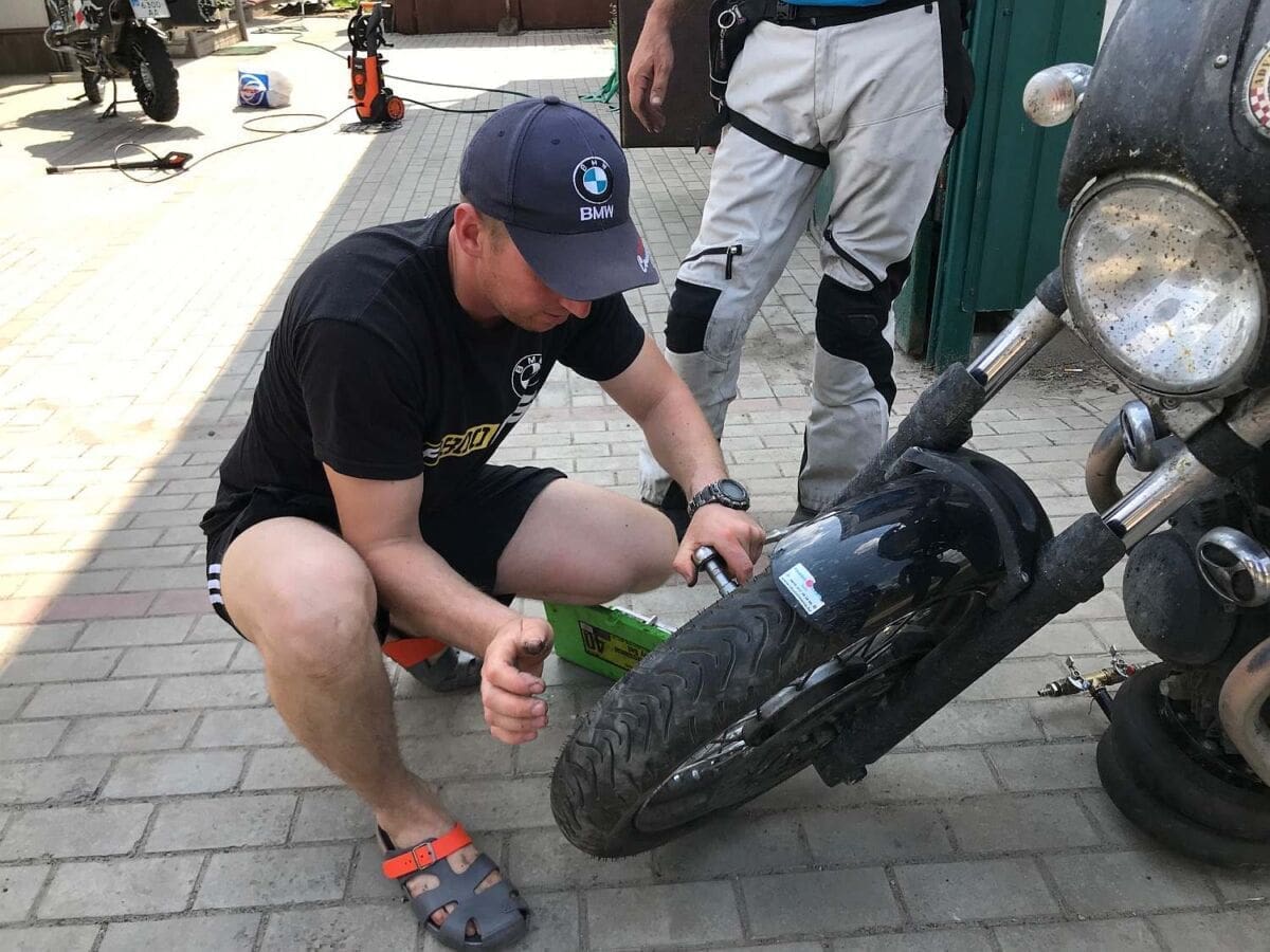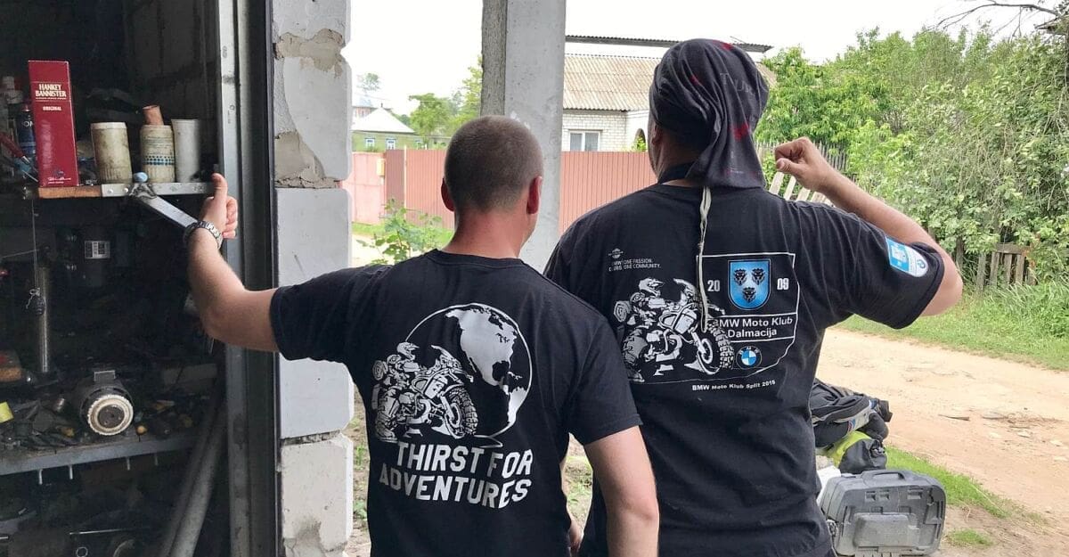 Samo 20 metara od granice krpimo gumu i tek iz trećeg pokušaja krenemo prema prvom gradu gdje će nam biti pružena pomoć oko Mustapićeve gume. Jako lošom cestom dolazimo do grada Glukhiv i pred kuću Sergeja koji u garaži ima 2 BMW motorkotača.