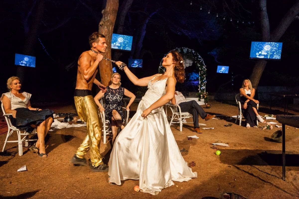 Na svadbeno slavlje gdje za stolom nalazimo likove koji su do nas potegli iz vremena Brechtovog Pira, stiže novi, nezvani gost - Aziz. Različit. Koji ne pripada poznatoj situaciji. Tamnije boje kože. Dakle, vjerojatno Arapin. I do tada veselo anarhična slika obitelji mijenja se pod utjecajem poznatih nam predrasuda - otkriva se njeno malograđansko naličje koje pod utjecajem sveprisutne propagande ne zna više prihvatiti drugačijost. U plesaču Azizu, očekivano i nažalost predvidljivo, vidi terorista.