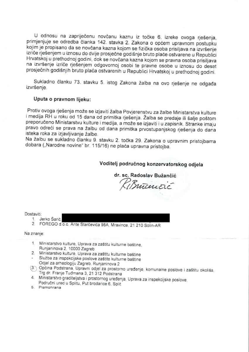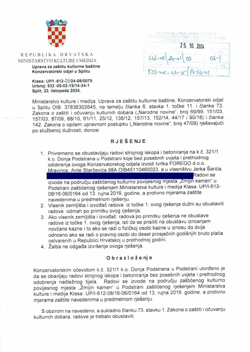 Voditelj područnog konzervatorskog odjela Split Ministarstva kulture dr.sc. Radoslav Bužančić zatražio je od investitora Jerka Šarića iz Podstrane i izvođača radova tvrtku Forego d.o.o. sa sjedištem u Mravincima da obustave radove strojnog iskopa i betoniranja bez posebnih uvjeta i prethodnog odobrenja nadležnog tijela uz prijetnju novčanom kaznom.