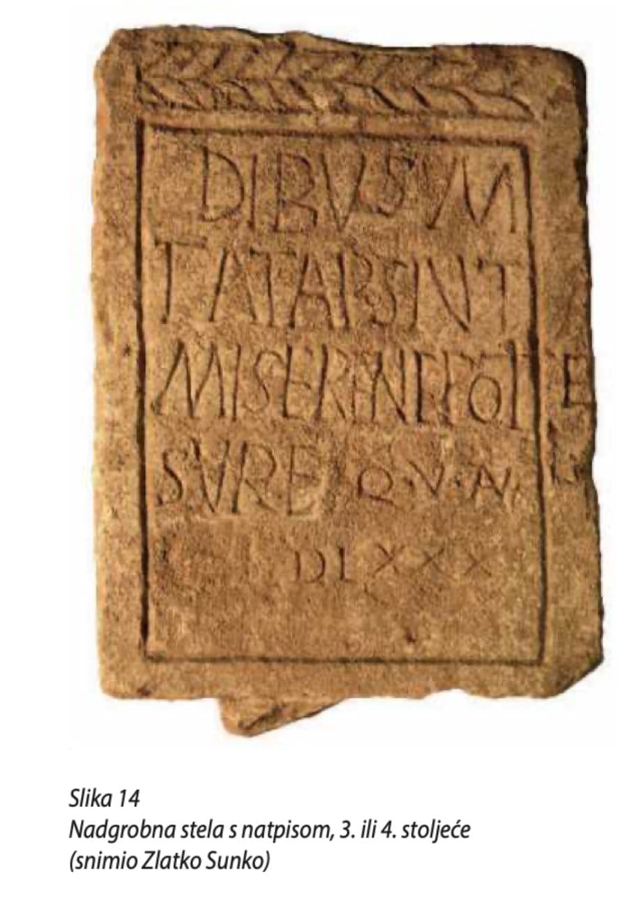 Među nalazima se ističe i nadgrobna stela s oštećenim dijelom natpisa. Prema preliminarnom čitanju, natpis govori da je žena podigla spomenik nećakinji koja je živjela deset godina. Zanimljivo je da natpis ima greške i odlike vulgarnog latiniteta, što ga čini vrijednim ne samo kao “spomenik”, nego i kao dokument jezika svakodnevice. Po tipu spomenika i sadržaju natpisa, stela se okvirno datira u 3. ili 4. stoljeće.