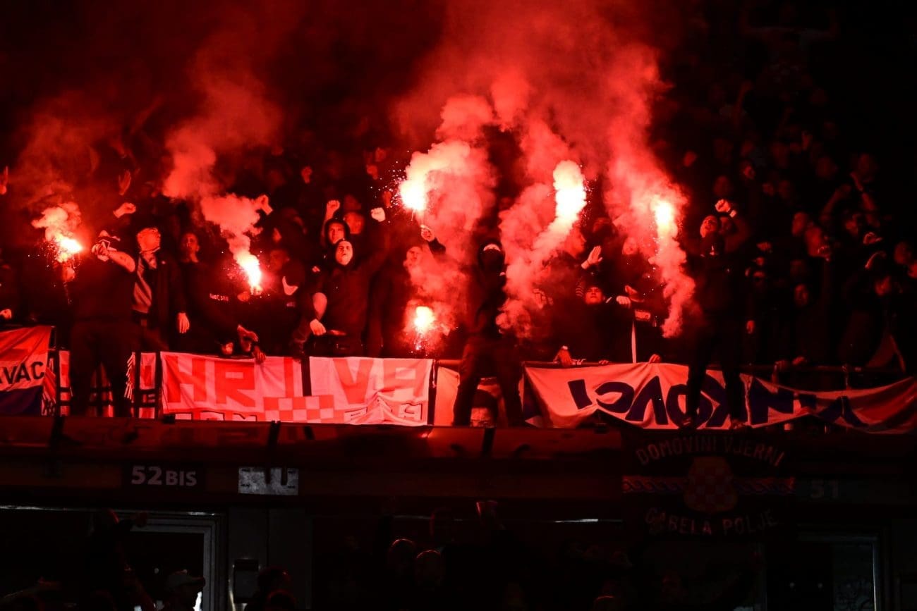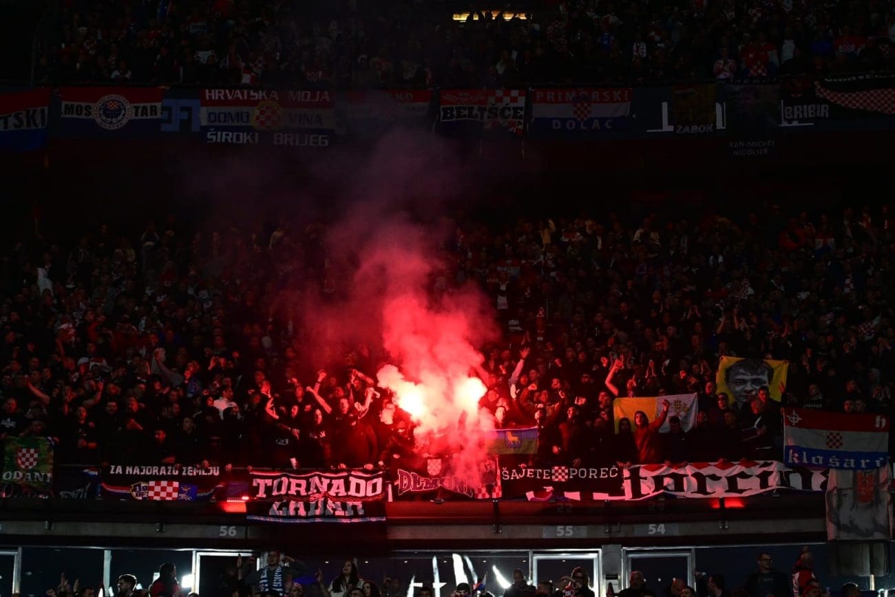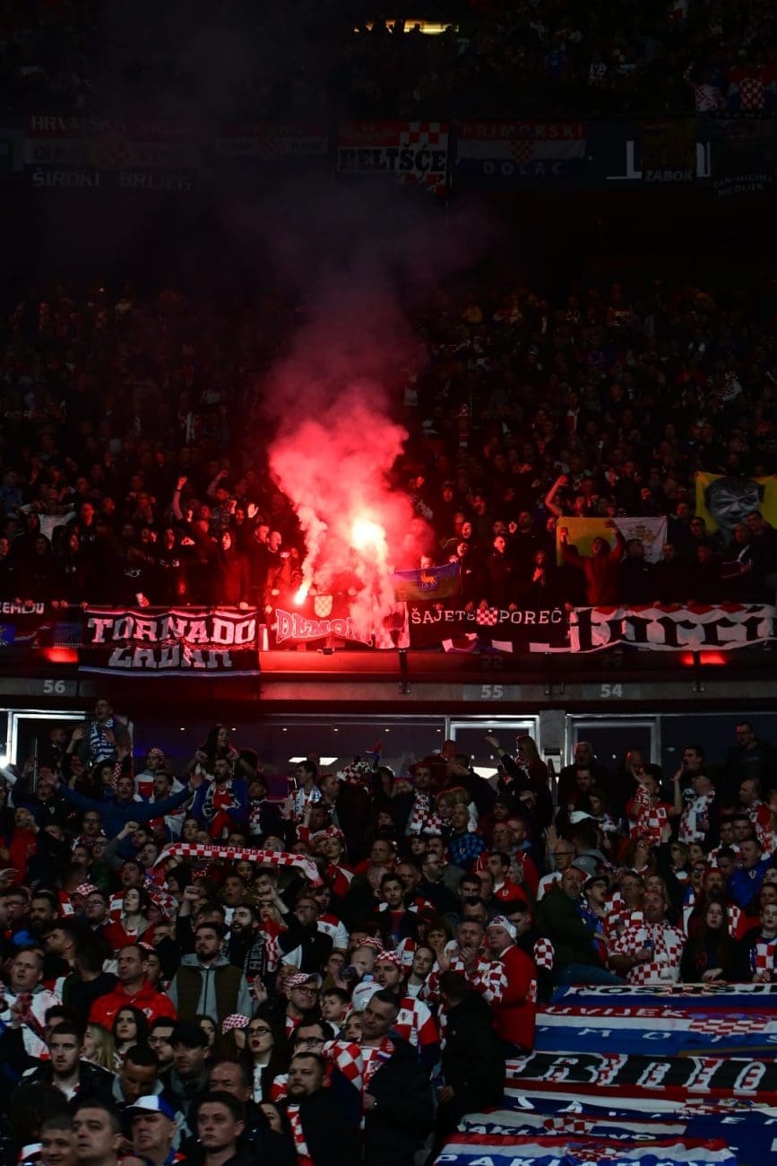 Vatreni se grčevito brane i daju sve od sebe. Hrvatski navijači sjajno navijaju i bodre naše nogometaše, a zapaljene su i baklje na njihovo tribini.