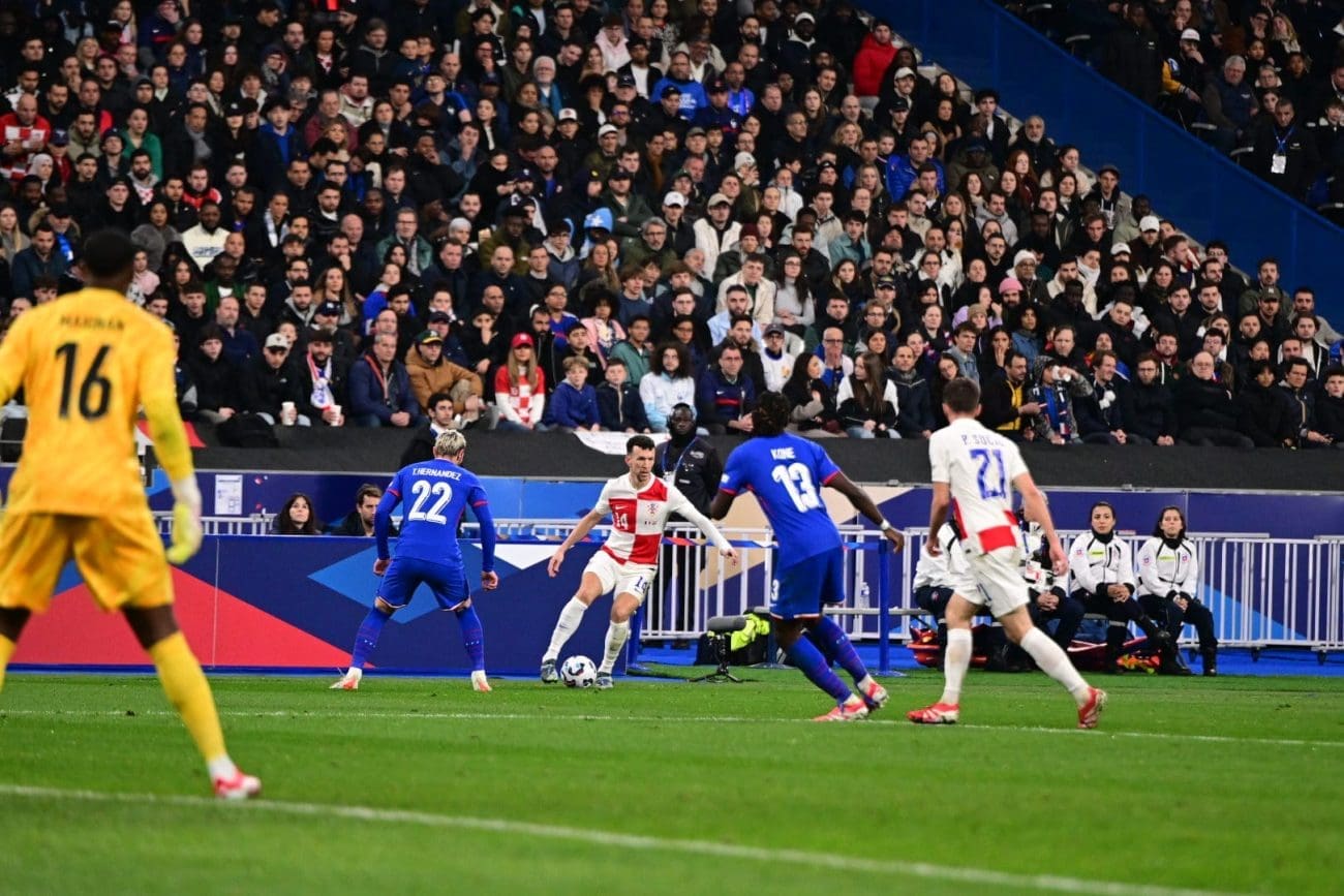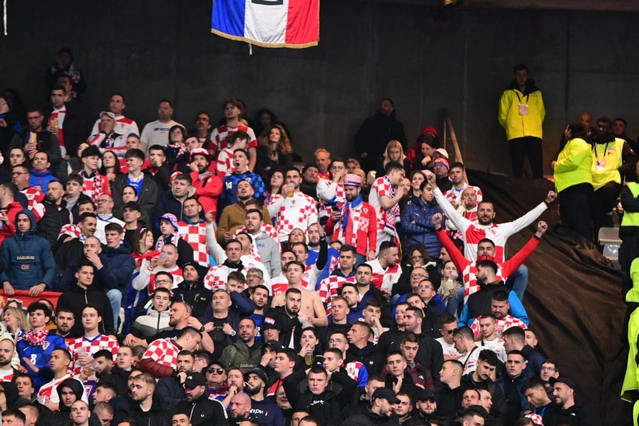 Oko 4.000 hrvatskih navijača nalazi se na stadionu i bodri naše reprezentativce. U svakom slučaju, hrvatski navijači su jako glasni i srčano bodre naše igrače. Na početku drugog poluvremena Francuska je povela golom iz slobodnog udarca. Pao je Mbappe prije kaznenog prostora, Francuska je imala slobodni udarac. Izveo ga je Olise i matirao ukopanog Livakovića za 1:0. Nažalost, u 80. minuti Dembele je anulirao prednost iz Splita i zabio je za 2:0.