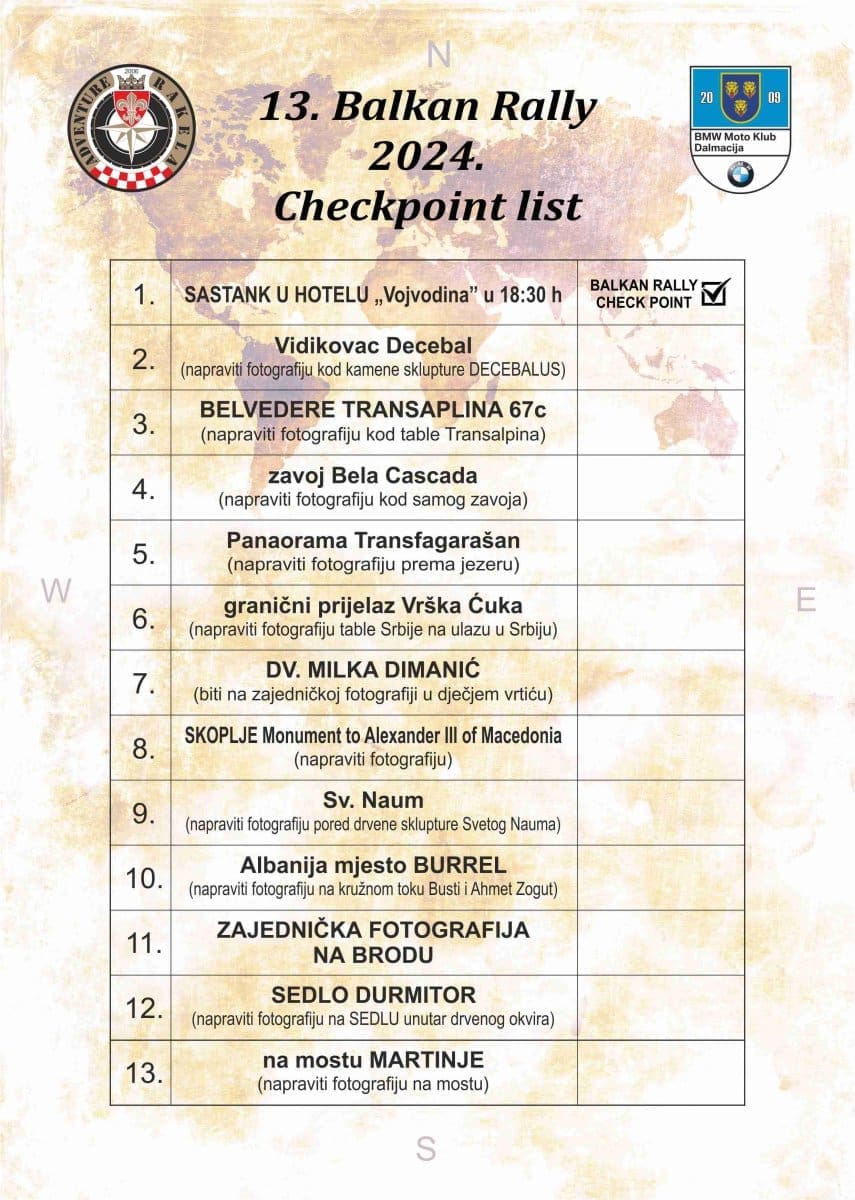 Sudionici će tijekom osam dana prijeći čak 4.000 kilometara kroz osam zemalja: Hrvatsku, Srbiju, Rumunjsku, Bugarsku, Makedoniju, Albaniju, Crnu Goru i Bosnu i Hercegovinu. Na svojoj ruti obići će neka od najpoznatijih prirodnih i kulturnih znamenitosti, kao što su: