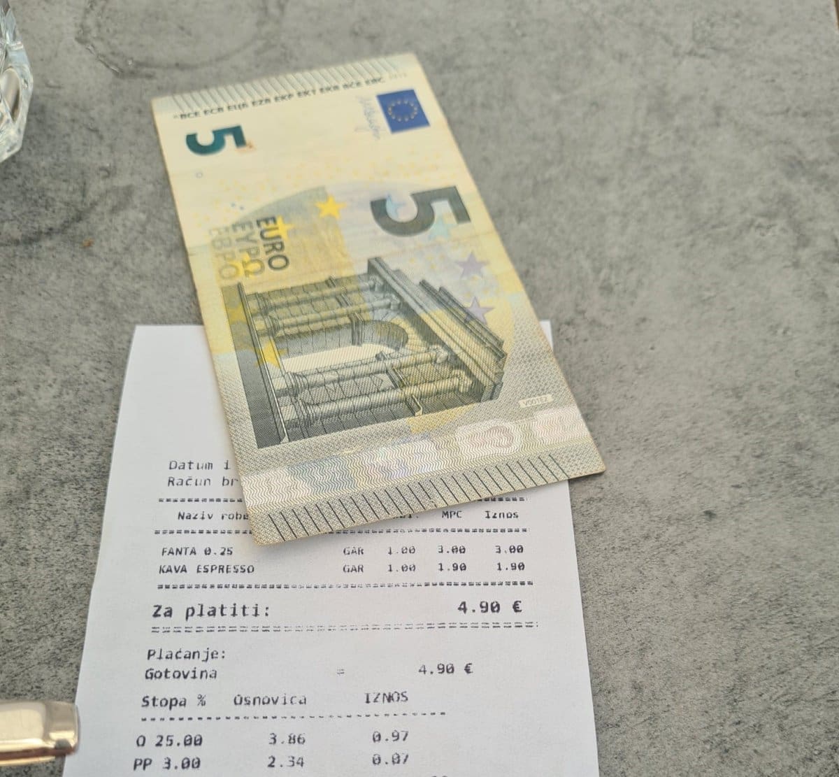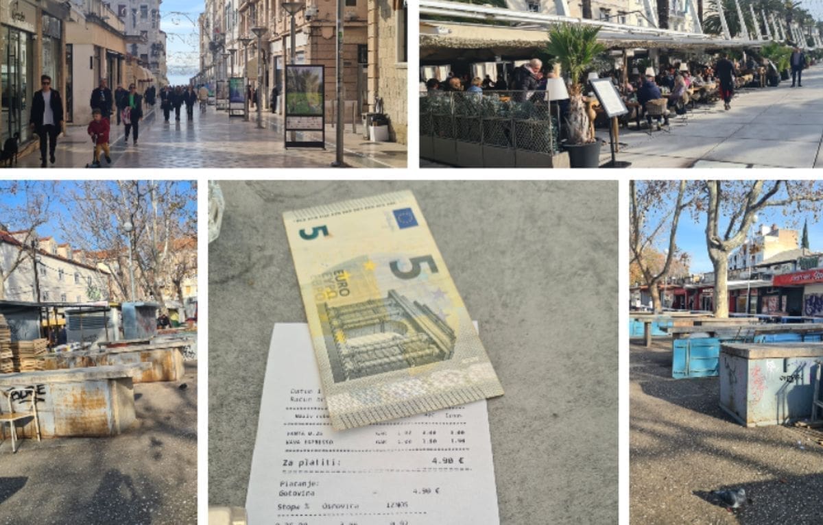 U jednom od kafića na Rivi cijene su na računu već izražene samo u eurima. Nema više dvojnog iskazivanja cijena. Stoga nas je iznenadila cijena od gotovo 5 eura za kavu i Fantu. Kad se preračuna, nije ni malo. Za običnu kavu i sok.