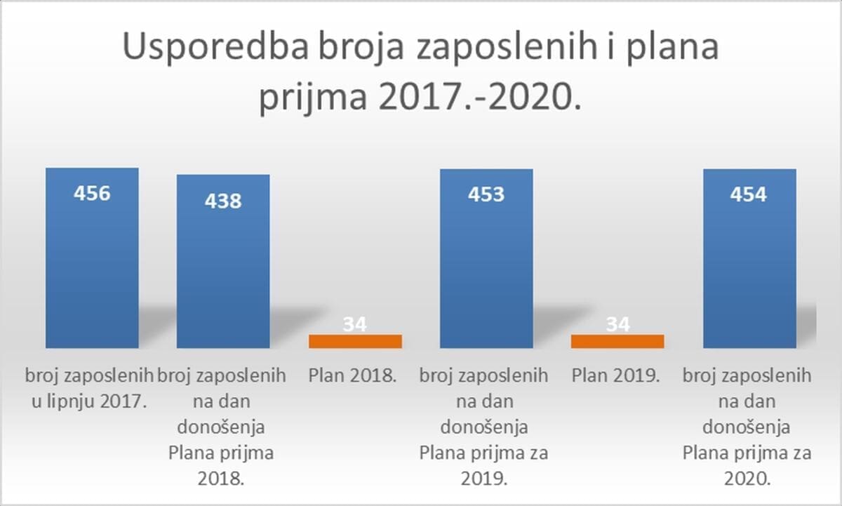 "Planom prijma, koji nije obvezujući, ne znači zapošljavanje i kao ni prethodnih godina, ne očekuje se da će biti u potpunosti izvršen, izražene su potrebe za 25 službenika magistara struke ili stručnih specijalista struke, 6 službenika sveučilišnih ili stručnih službenika, 18 službenika srednje stručne spreme te 3 namještenika niže stručne spreme.