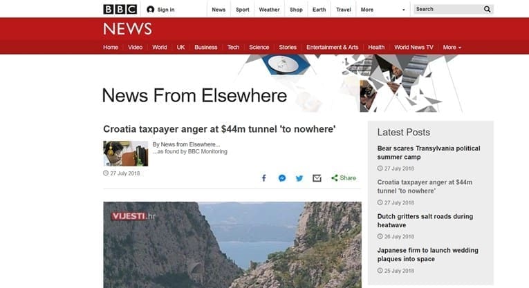 BBC se, doduše, u svom članku poziva na hrvatski RTL, no zanimljivo je kako je problematika tunela koji od nikuda vodi nigdje zanimljiva i izvan granica Hrvatske.