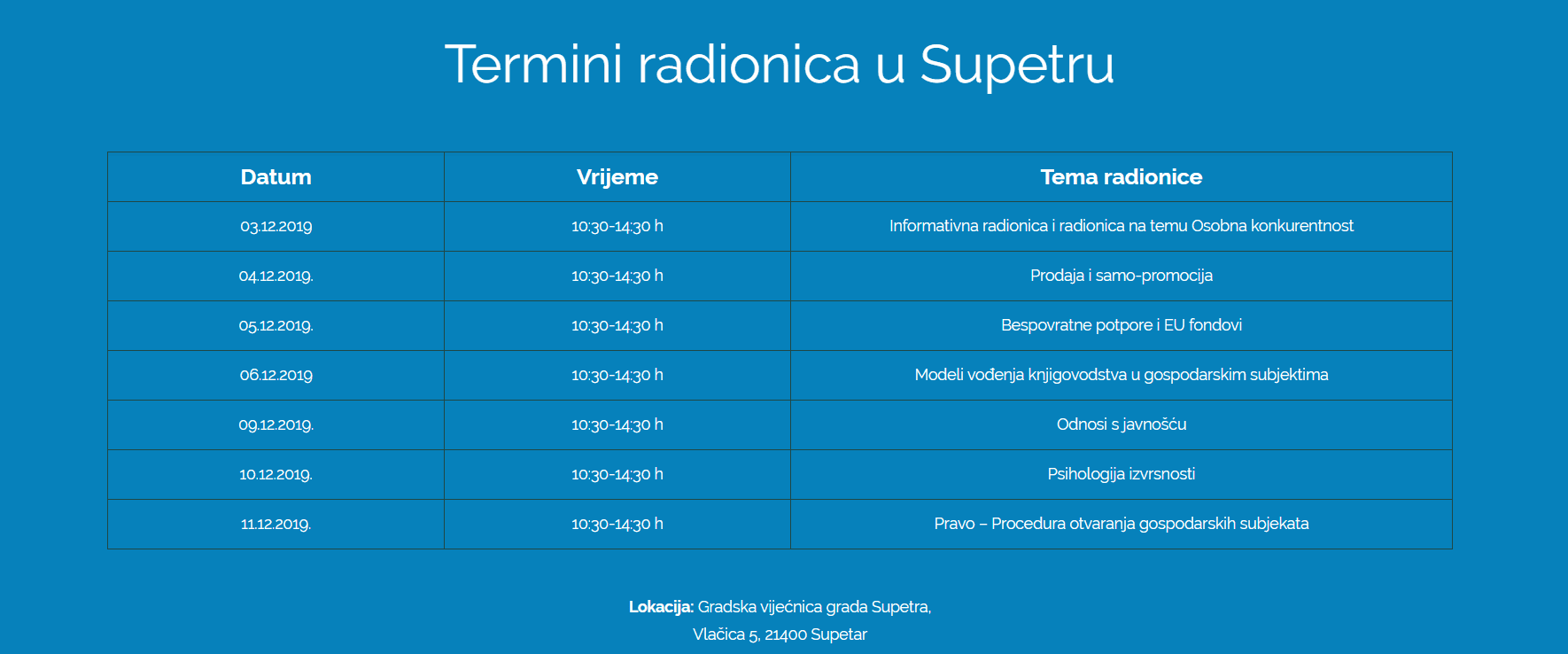 Edukativne radionice održavaju se u Gradskoj vijećnici Grada Supetra (Vlačica 5).Sve radionice započinju u 10.30 sati. Osim online na stranici inkubator-zaposljavanja.eu, za sudjelovanje se može prijaviti i direktno dolaskom na radionicu uz predočenje osobne iskaznice. Sve informacije o projektu, predavačima, načinima prijave kao i detaljan raspored svih radionica u može se pronaći na navedenoj web stranici te na Facebook stranici 'Inkubator zapošljavanja'.