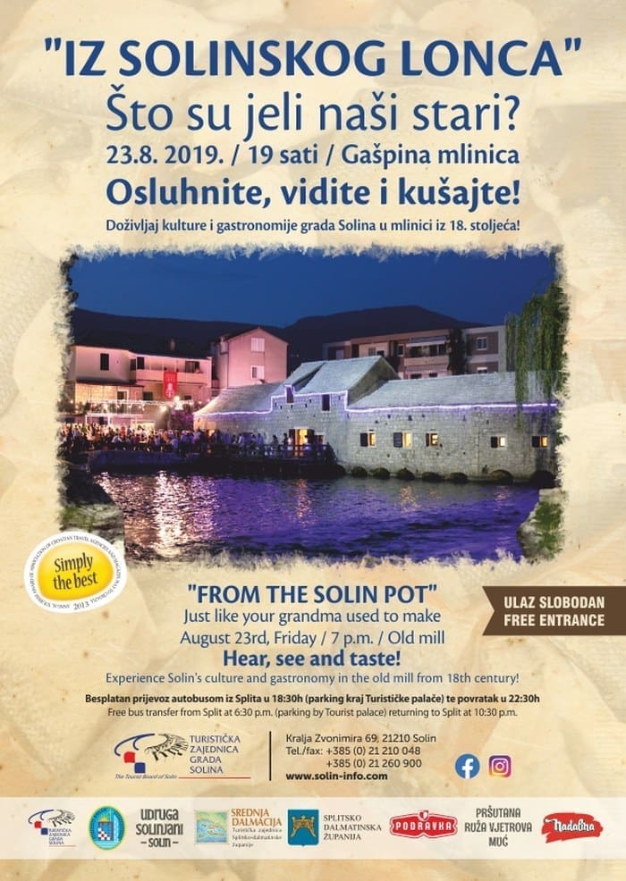 Devetu godinu zaredom održat će se gastronomska manifestacija “Iz Solinskog lonca – što su jeli naši stari?”. Manifestacija će se već tradicionalno održati na prostoru Gašpine mlinice u petak 23. kolovoza s početkom u 19 sati. Riječ je o gastronomskoj manifestaciji, dobitnici nagrade Simply the best 2014, priznanja za inventivnost u razvoju turističke ponude, koja se svake godine održava u Gašpinoj mlinici, dobitniku plavog cvijeta HTZ-a za najbolji turistički proizvod, a koja za cilj ima prezentaciju bogate kulturno povijesne baštine, te gastronomskih specijaliteta grada Solina.