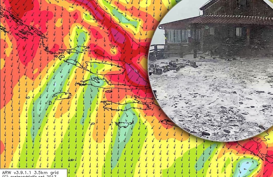 Prolaskom fronte zapuhala je bura prvo u sjevernoj Dalmaciji, a onda se tijekom popodneva širila prema jugu. S burom je došlo do pada temperature zraka pa je kiša višim planinama okrenula na snijeg. Jak snijeg trenutno pada na Dinari, Kamešnici, Biokovu i Svilaji iznad 1200 metara nadmorske visine, a snježna granica se postupno spušta.