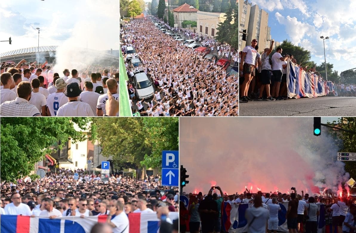 Ulice Splita danas su pune navijača i obojane u boje Hajduka koji od 21 sati na Poljudu igra prvu utakmicu 3. kola kvalifikacija za UEFA Konferencijsku ligu.