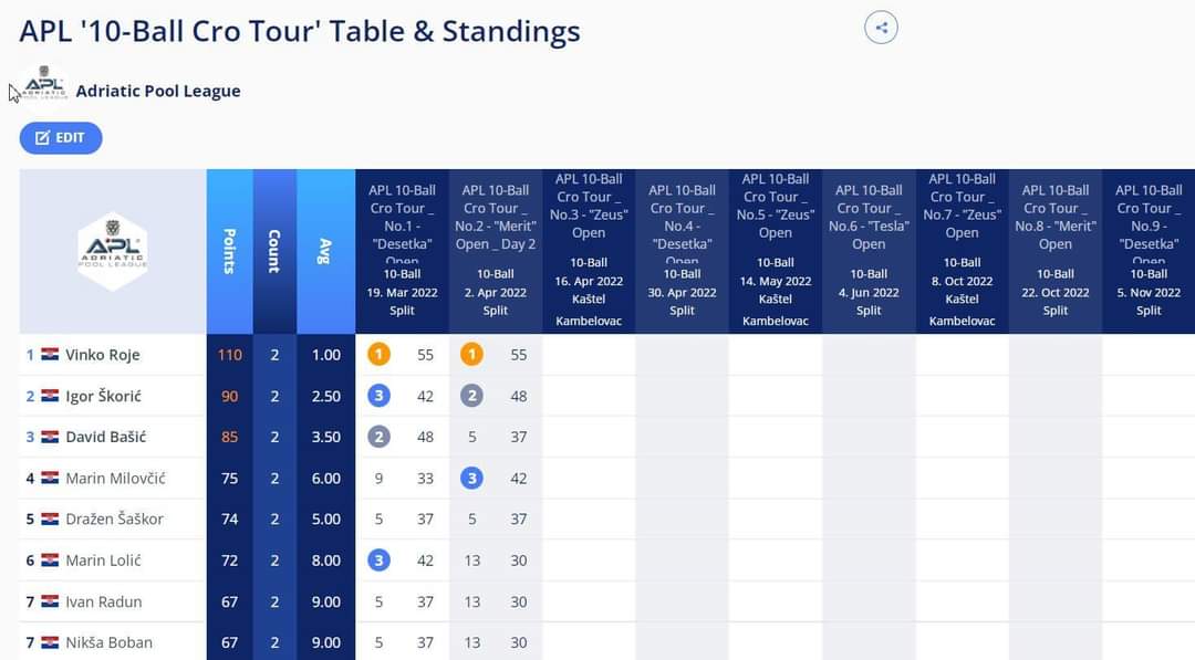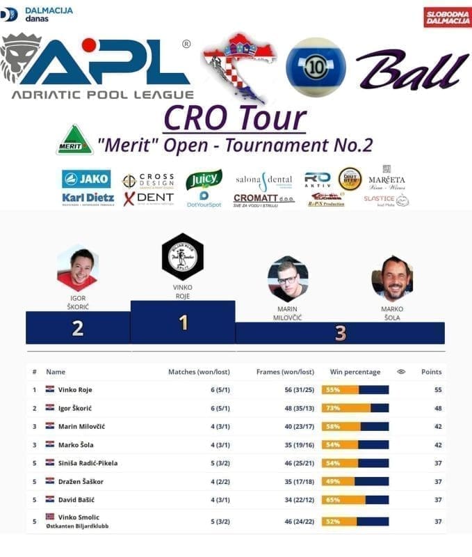 Protekli vikend je u splitskom klubu Merit odIgrano drugo kolo APL "10 BALL TOUR" biljarske lige.
