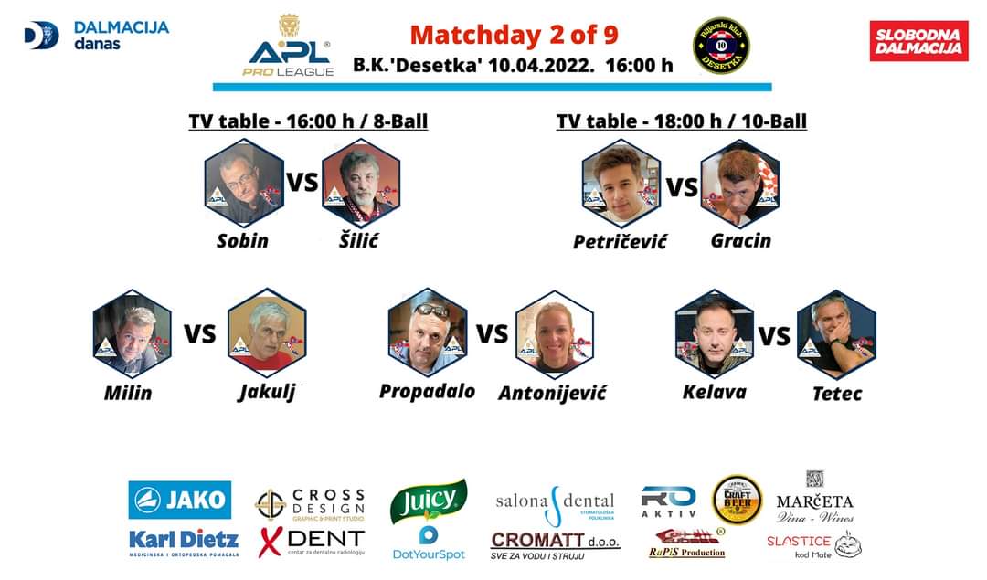 Također, u nedjelju će se odigrati u biljarskom klubu Desetka drugo kolo APL "Pro league". Raspored je na fotografiji ispod: