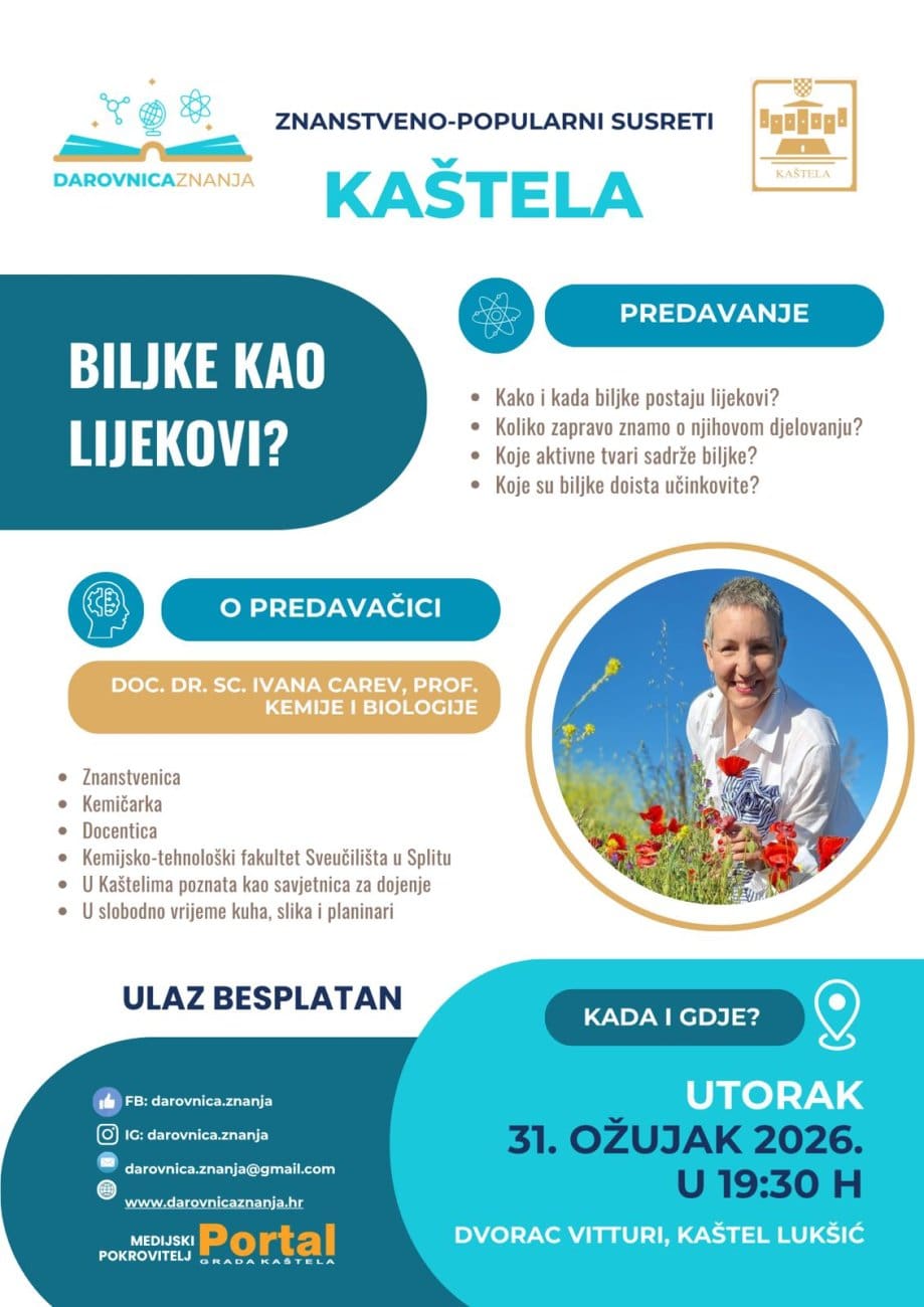 U sklopu znanstveno-popularnih susreta „Darovnica znanja“, u Kaštelima će se održati zanimljivo predavanje pod nazivom „Biljke kao lijekovi?“, koje će publici približiti odnos između prirode, znanosti i zdravlja.