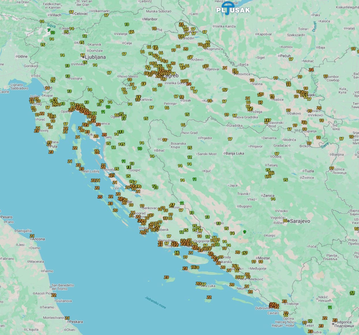 Danas će biti pretežno vedro. Ujutro i navečer slaba bura, danju vjetar zapadnih smjerova koji će najjači biti na otvorenom moru Dalmacije u kasnim popodnevnim satima. Navečer podno Velebita bura u jačanju. Minimalne jutarnje temperature zraka od 10°C ponegdje u Dalmatinskoj zagori do 21°C ponegdje uz obalu i na otocima. Najviše dnevne temperature većinom od 26 do 31°C.
