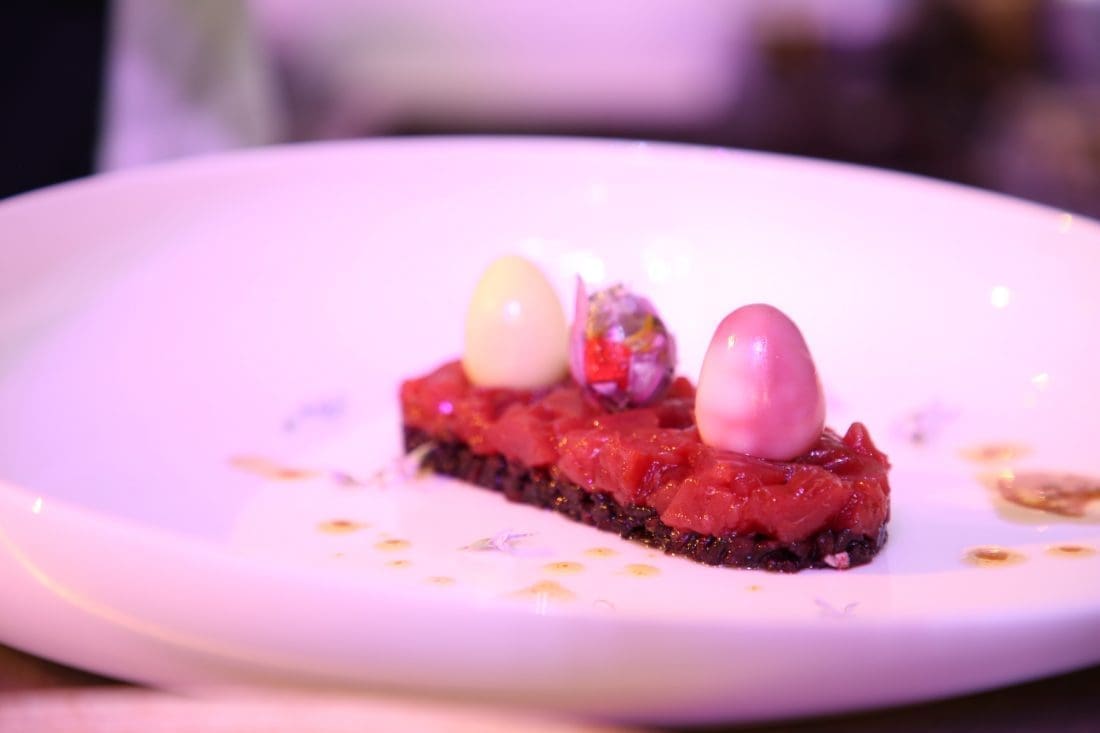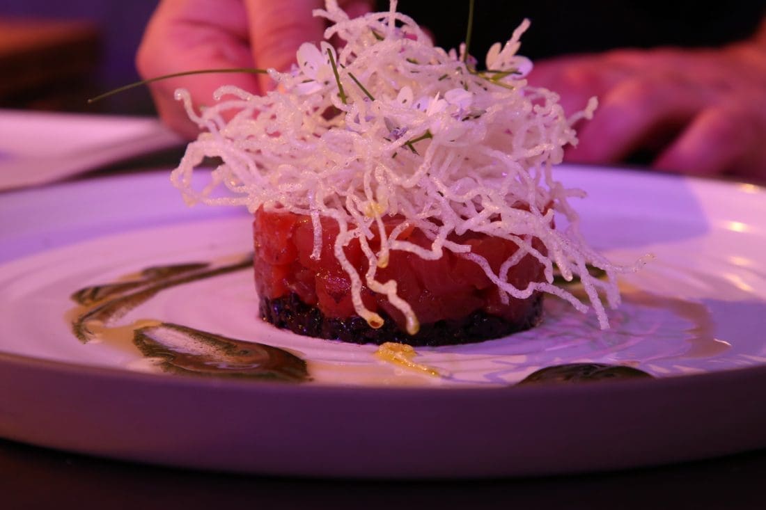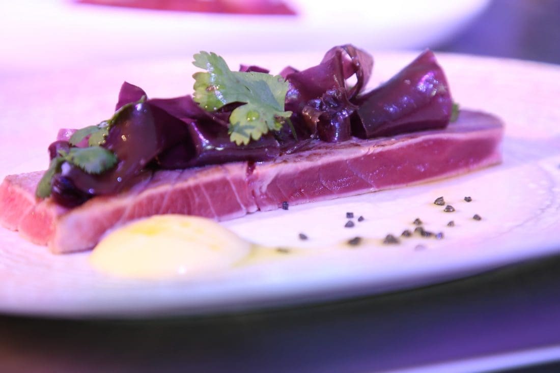 Tako je tartar od ove ribe radio s crnilom od sipe, crnom rižom, sezamom, prepeličjim jajima i drugim namirnicama koje spajaju Aziju i Europu. U drugom jelu je potrbušinu tune pripremio je s avokadom i korijanderom, a svoj je nastup zaokružio „proljetnom tunom“ gdje je iskoristio vezicu svježe pšenice i divlji luk.