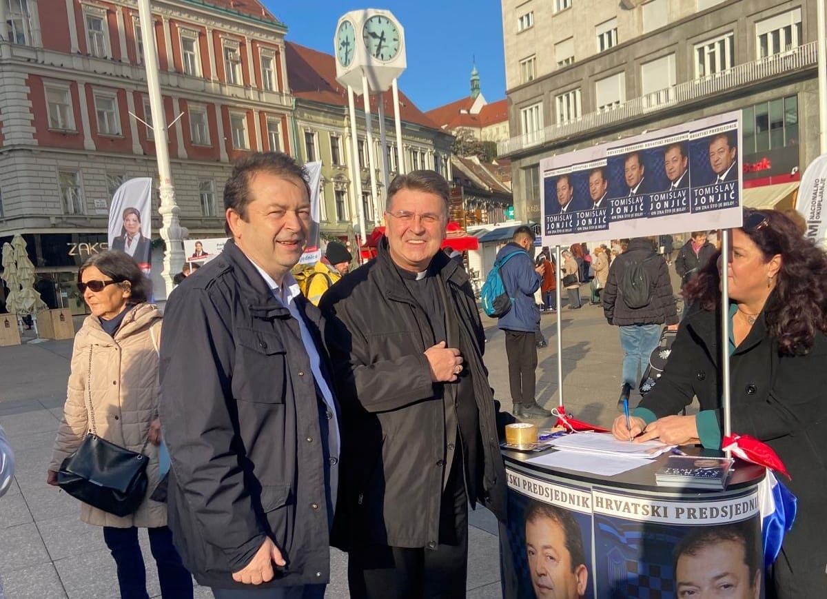 Predsjednički kandidat Tomislav Jonjić na društvenim mrežama je objavio slike skupljanja potpisa, a na na jednoj fotografiji vidi se u razgovoru s mons. Ivanom Šaškom, pomoćnim biskupom zagrebačkim.