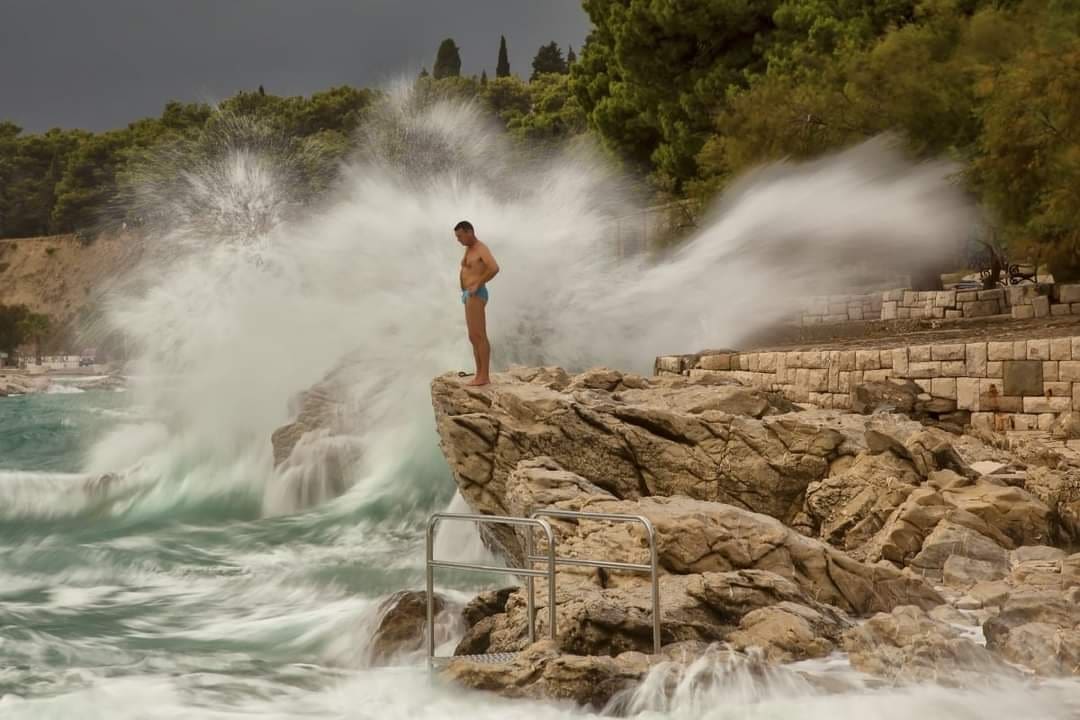 U Splitu su valovi dosezali 4 metra, no to nije sputalo jednog kupača da se danas baci u more na potezu između Zvončaca i Ježinca. Sjajan prizor uhvatio je poznati splitski fotograf Darko Rom. U ovom slučaju nije posebna hrabrost okupati se u moru čija je temperatura 21°C, ali je hrabrost suočiti se s tako valovitim morem...