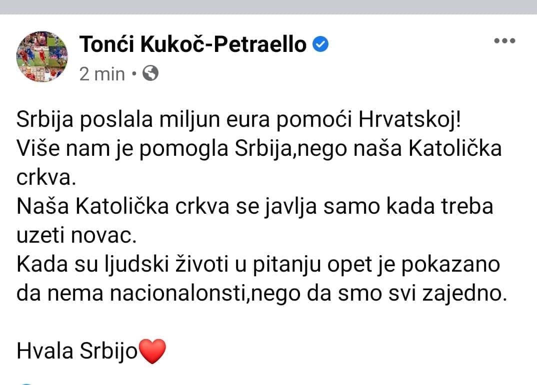 Kada su ljudski životi u pitanju, opet je pokazano da nema nacionalnosti, nego da smo svi zajedno. Hvala Srbijo", napisao je Kukoč-Petraello u srijedu ujutro na svome zidu.