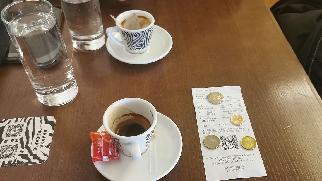Prije jutarnje šetnje po Marjanu s nordijskim štapovima bilo je zanimljivo i pomalo uzbudljivo popiti kavu uz brojenje eura i kuna kako bi pravilno platili priloženu cijenu kave. Uz cijenu kave treba brojiti povrat kovanica i visinu uobičajene napojnice.