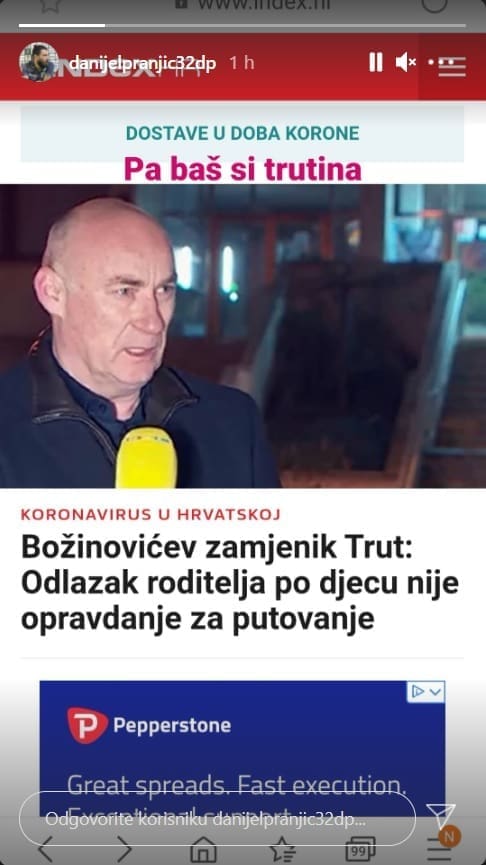 Nakon što je na Indexu pročitao da je šef Civilne zaštite i zamjenik čelnika nacionalnog Stožera Davora Božinovića Damir Trut izjavio da odlazak roditelja po djecu nije opravdanje za putovanje, bivši Vatreni Danijel Pranjić nije se suzdržavao na Instagramu.
