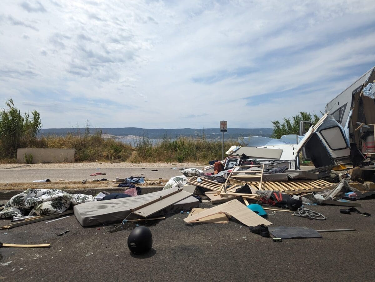 Autobus je udario u zadnji dio kampera te ga je raznio. Dijelovi su razasuti po nogostupi ali i po kolniku.