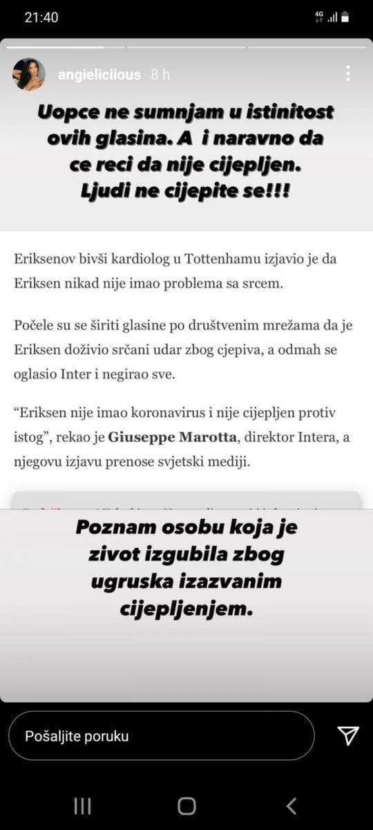 Sinjanka je komentirala članak u kojem se spominje izjava bivšeg kardiologa u Tottenhamu o tome da Danac nije imao srčanih problema prije posljednjeg slučaja, ali i glasine na društvenim mrežama da je doživio srčani udar zbog cijepljenja. Inter je demantirao da je Eriksen bilo imao koronu, bilo da je cijepljen.