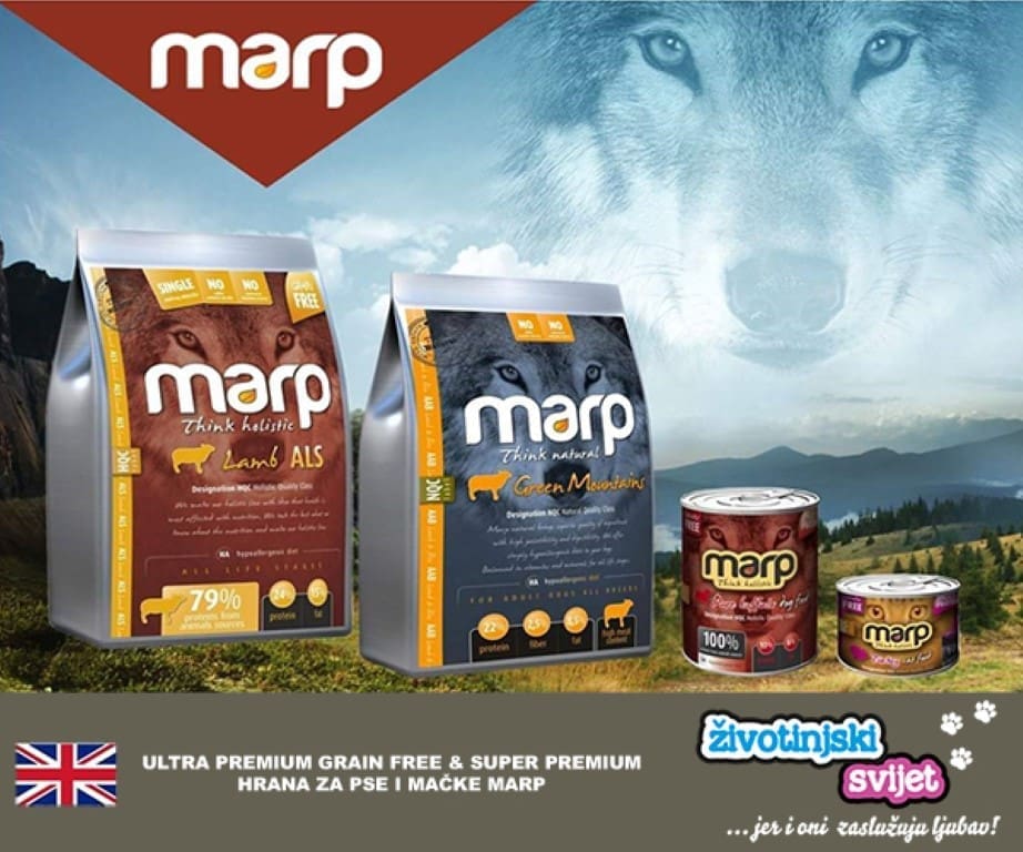 Ako je vaš ljubimac pas, od hrane svakako preporučamo ultrapremium brand MARP, hranu bez žitarica prilagođenu za sve vrste pasa i sve dobne skupine. Dolazi u suhoj varijanti u obliku kroketa s čak 84% proteina životinjskog porijekla, jer u svom sastavu ima samo meso i ljekovito bilje. Ova hrana ima izbalansiran postotak proteina i masti, izrazito je prilagođena štencima, velikim psima, starijima te onima s problemima s probavom, dlakom, alergijama... MARP ima i mokru hranu, u konzervama od 400 g i 800 g, po sastavu 100% čisto meso ili 95% meso, a 5%povrće, kao i paštetice od 100 g istog sastava. A za žvakanje imamo MARP poslastice od bizonovog repa, vratnih tetiva, sušene govedine ili sušene piletine, bez konzervansa i alergena te keksiće od janjetine za nagradice.
