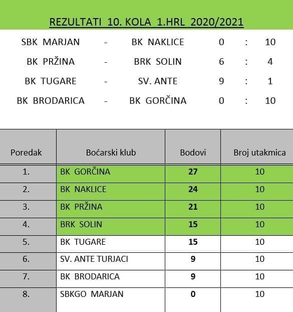 Nakon što su završila boćarska raffa prvenstva po disciplinama, boćari su se okrenuli ligaškim obvezama. Četiri najbolje ekipe će izboriti „final four“ turnir, a u 10. kolu su snage u derbiju odmjerili Pržina i Solin.