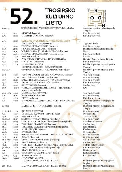 "52. Kulturno ljeto nudit će bogat program raznovrsnog karaktera od koncerata, festivala, predstava do izložbi i prezentacija. U srpanj ulazimo s koncertom Gibonnija u Kuli Kamerlengo. Svečano otvaranje održat će se na glavnom gradskom trgu nastupom Zagrebačke filharmonije. Orkestar stoljetne tradicije vrhunskog muziciranja promotor je glazbene umjetnosti diljem Hrvatske još od 1871., a nastup u Trogiru bit će pravi kulturni spektakl. 14. izdanje Međunarodnog Festivala klasične glazbe započinje 7. srpnja. Opera Selecta dovodi najbolje hrvatske i svjetske glazbenike do 22. srpnja koncertima na otvorenoj pozornici Kule Kamerlengo, Trgu Ivana Pavla II i u Kneževom dvoru. Nastupit će iznimni mladi hrvatski umjetnici: sopranistice Josipa Bilić i Neža Vasle, mezosopranistica Emilia Rukavina, tenor Filip Filipović i bariton Davor Nekjak, pijanistica Julija Gubajdulina.