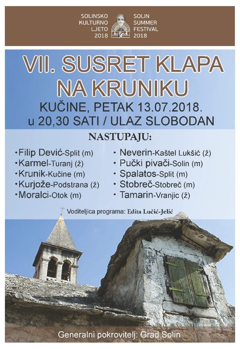 U sklopu Solinskog kulturnog ljeta na pozornici u Kućinama održat će se "VII. Susret klapa na Kruniku". Druženje uz klapsku pismu predviđeno je u petak 13. srpnja od 20:30 sati. Ulaz je slobodan.