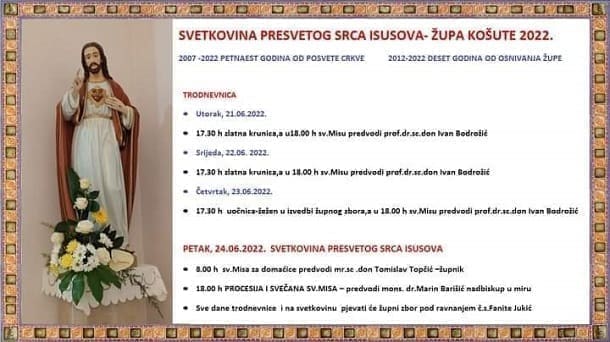 Svetkovina Presvetog Srca Isusova je u petak, 24. lipnja. Jutarnja sveta misa služit ć se u 8 sati, a predvodit će je župnik don Tomislav Topčić. Procesija i svečana sveta misa su u 18 sati, a predvodit će ih mons. dr. Marin Barišić, biskup u miru.