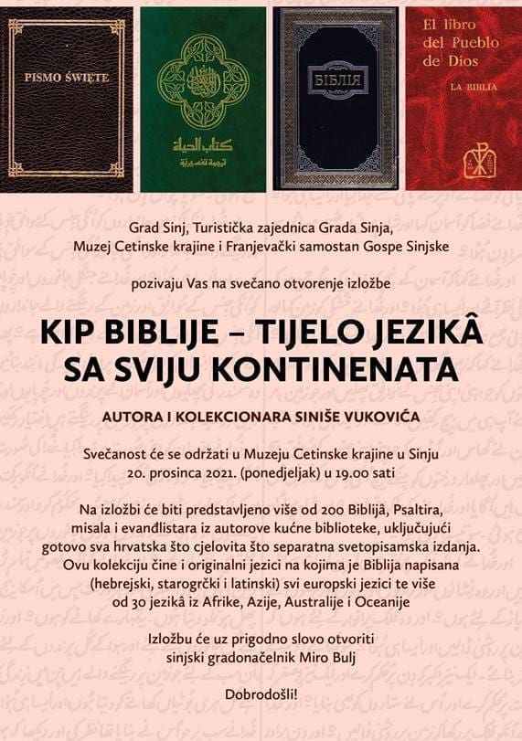 Program Adventa u Sinju bogatiji je za još jedan izniman događaj – izložbu Kip Biblije – tijelo jezikâ sa sviju kontinenata književnika i publicista Siniše Vukovića koji već 20 godina prikuplja Sveto pismo na različitim jezicima. Autor izložbe je na ideju o skupljanju Biblija došao spontano kada je bio na hodočašću u Rimu 1997. godine gdje je kupio Bibliju na hebrejskom jeziku, a prijatelji bogoslovi su mu darovali i primjerak na španjolskom jeziku. Neobičan hobi prerastao je u zavidnu i vrijednu zbirku – Siniša Vuković vlasnik je i gotovo svih izdanja Biblije na hrvatskom jeziku – među prikupljenim Biblijama su i neprocjenjivi primjerci kao što je onaj Bartola Kašića (najstariji hrvatski prijevod Biblije iz 1630. objavljen tek 2000.) te pretisak prvog objavljenog izdanja Svetog pisma Matije Petra Katančića iz 1831. godine. Vješti dijalektolog i čuvar bračke baštine, Vuković je neke dijelove čak preveo i na svoju selačku čakavštinu.