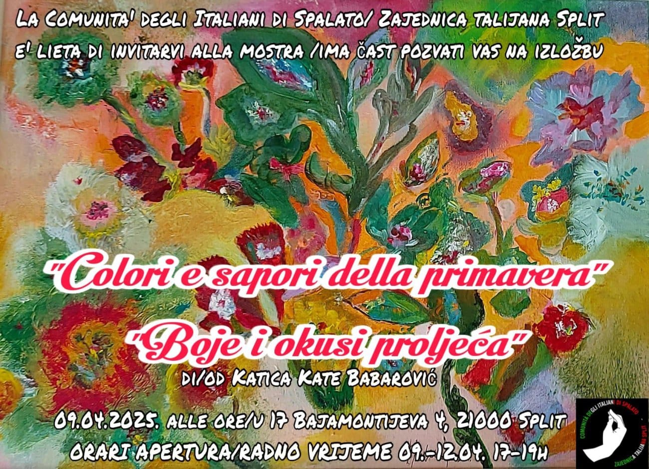 Zajednica Talijana u Splitu s ponosom predstavlja prvu samostalnu izložbu svoje članice, slikarice i pjesnikinje Katice Kate Babarović, pod nazivom "Colori e Sapori della primavera" ("Boje i okusi proljeća"). Izložba će se otvoriti 9. travnja 2025. godine u 17 sati u prostorijama Zajednice, smještenim u Bajamontijevoj ulici 4.