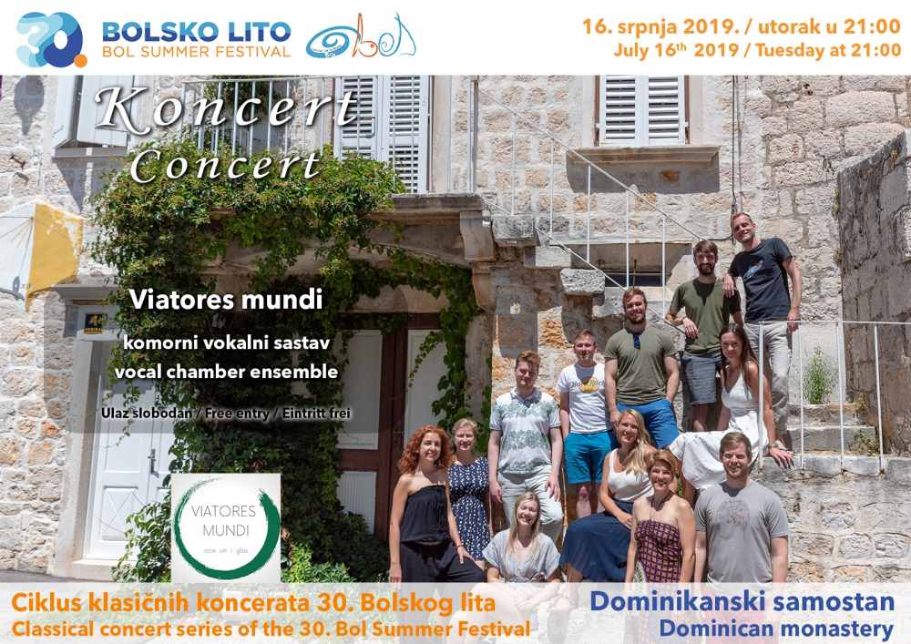 30.Bolsko lito donosi niz zanimljivih glazbenih programa i veliko bogatstvo interpretacija. Ovog utorka 16. srpnja u 21 sat u crkvi Dominikanskog samostana na programu je koncert komornog vokalnog sastava "Viatores mundi" koji se sastoji od talentiranih profesionalnih glazbenika iz cijelog svijeta. Posebnost, a ujedno i cilj njihovog sastava jest upravo povezivanje i proučavanje različitih zborskih tradicija.