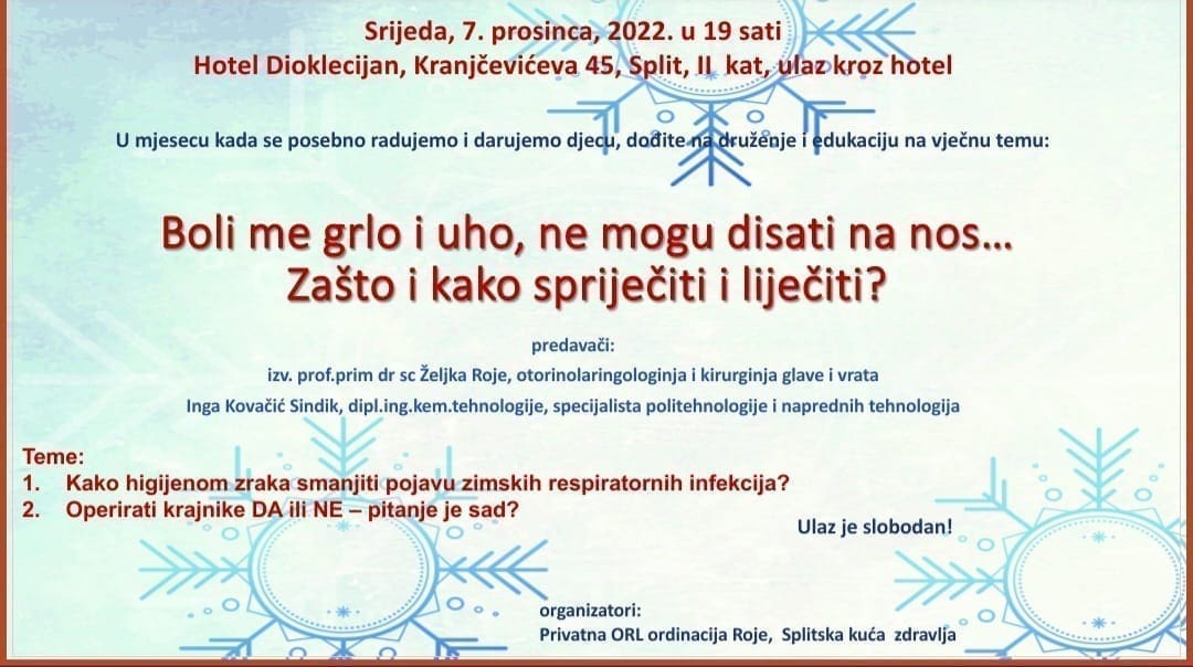 U srijedu 7. prosinca s početkom u 19 sati u hotel Dioklecijan (Kranjčevićeva 45, Split) održat će se predavanje na temu - Boli me grlo i uho, ne mogu disati na nos... Zašto i kako spriječiti i liječiti?