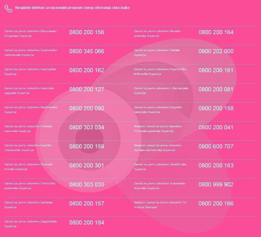Ako imate između 50 i 69 godina, a u posljednje dvije godine niste dobili poziv na mamografski pregled u sklopu Nacionalnog programa ranog otkrivanja raka dojke, možete se obratiti na dolje navedene brojeve telefona županijskih zavoda za javno zdravstvo i dogovoriti besplatan mamografski pregled.