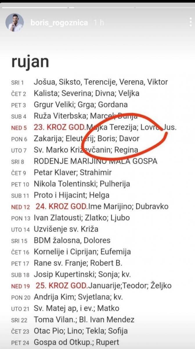 Na sljedećem storiju je otkrio da mu je, u ponedjeljak, 6. rujna imendan.