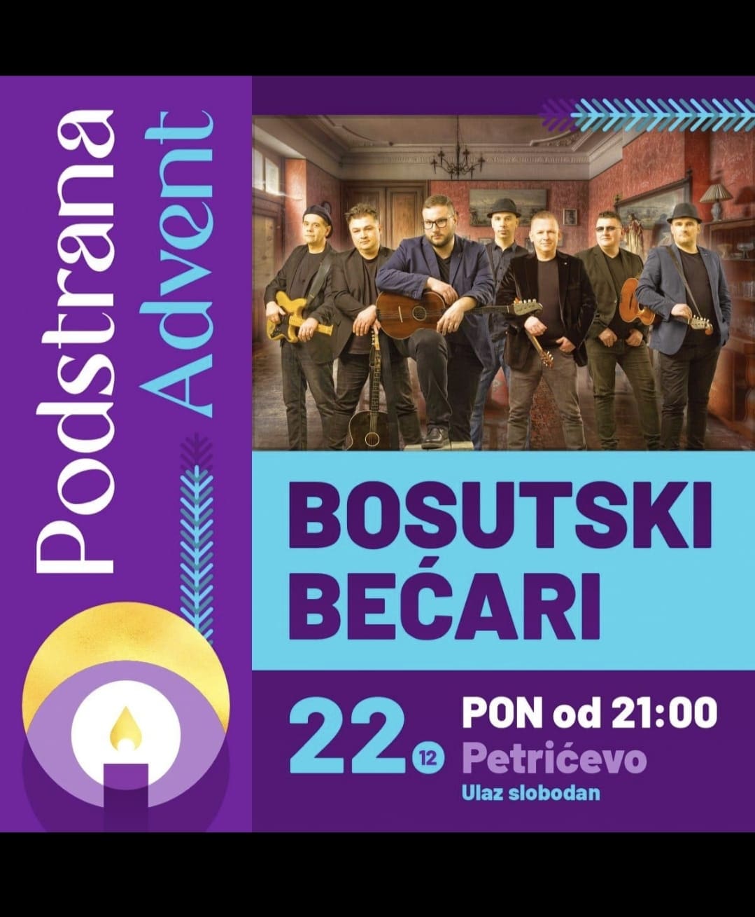 U sklopu Adventa u Podstrani, ljubitelje tamburaške glazbe večeras očekuje poseban glazbeni događaj. Na pozornici na Petrićevu nastupit će Bosutski Bećari, jedan od najpoznatijih tamburaških sastava u Hrvatskoj.