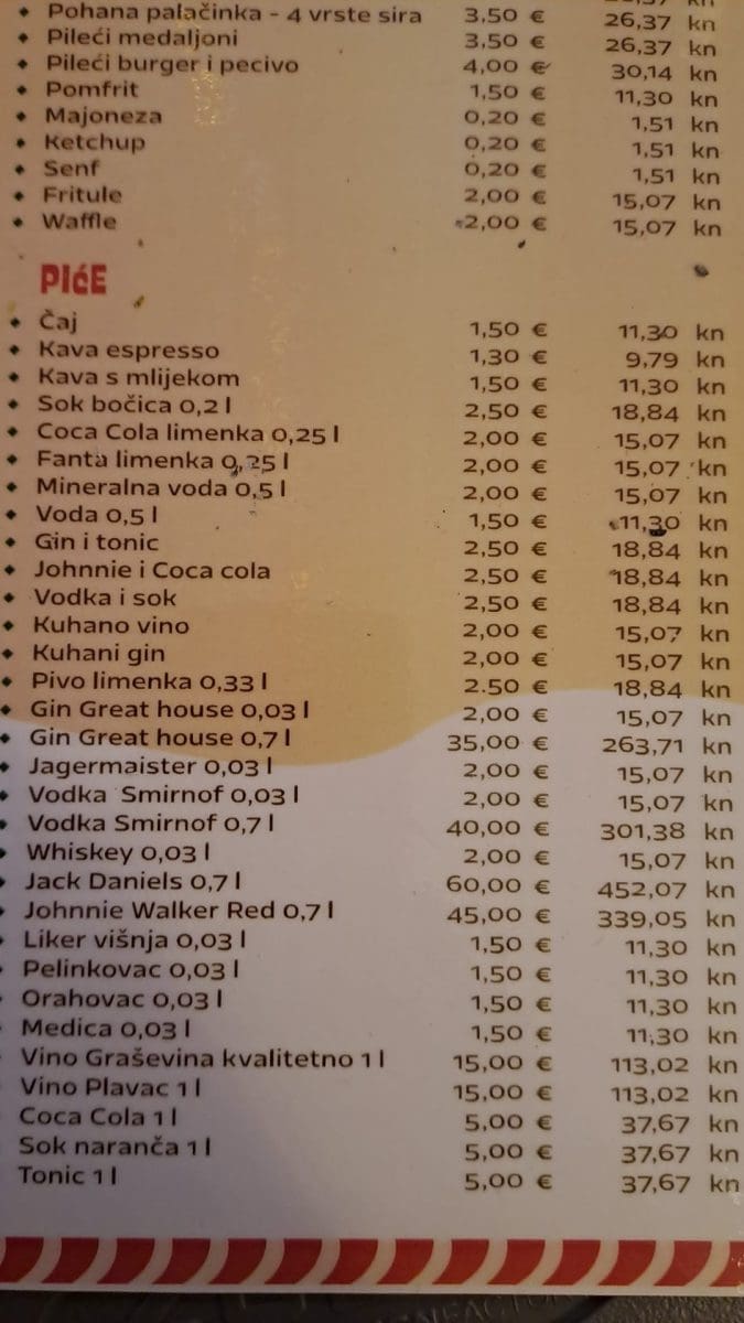 Kuhano vino su pili za samo 2 eura, kao i kuhani gin. Gin tonic i piva koštaju 2,5 eura, a s nečim kratkim možete 'prisić' za 1,5 eura.