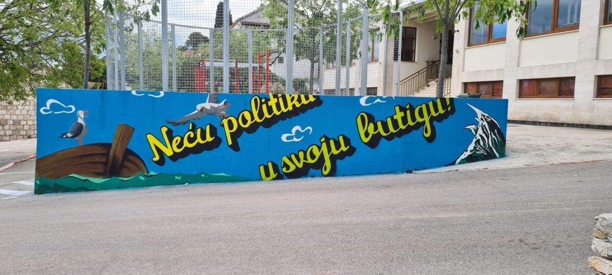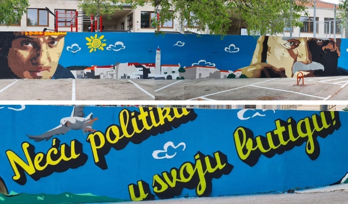 Na višemetarskom muralu dominiraju lica dviju legendi, plavo nebo s oblacima, motivi Dalmacije, motiv Sutivana i poznata krilatica "Neću politiku u svoju butigu".