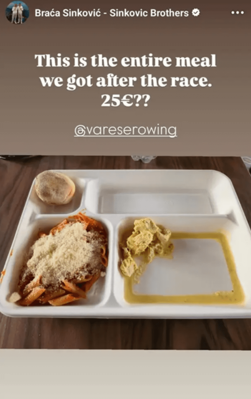 No nisu bili zadovoljni organizacijom obroka nakon utrke. Na društvenim mrežama požalili su se kako im Talijani nisu omogućili dostojan obrok nakon iscrpljujuće utrke. "Ovo je sve što smo dobili za jesti nakon utrke za 25 eura???", napisali su Sinkovići, prenosi Index.