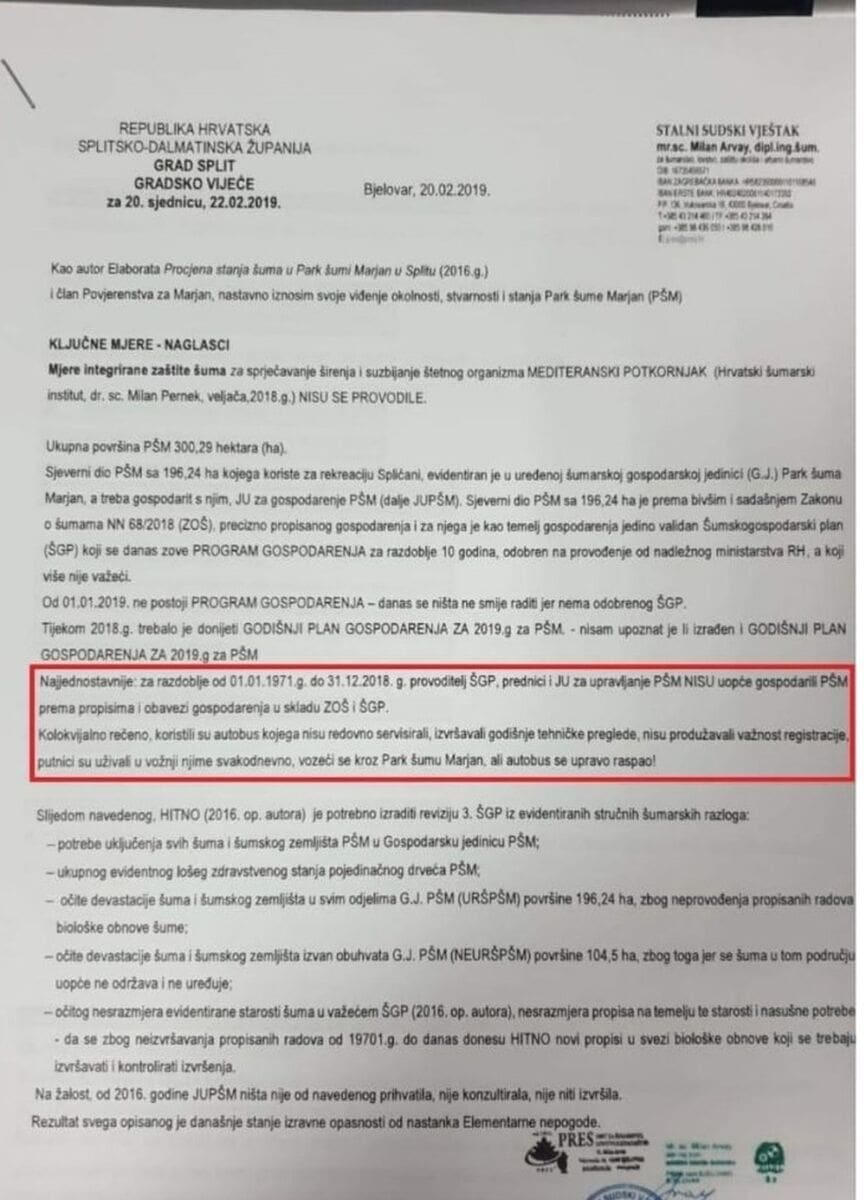 Stalni sudski vještak gospodin Milan Arvay nam je dostavio na početku sjednice dokument koji jasno kaže da se naš Marjan sustavno uništava od 1971. godine i da nisu opće gospodarili prema propisima i obvezi gospodaranje u skladu ZOŠ i ŠGPa.