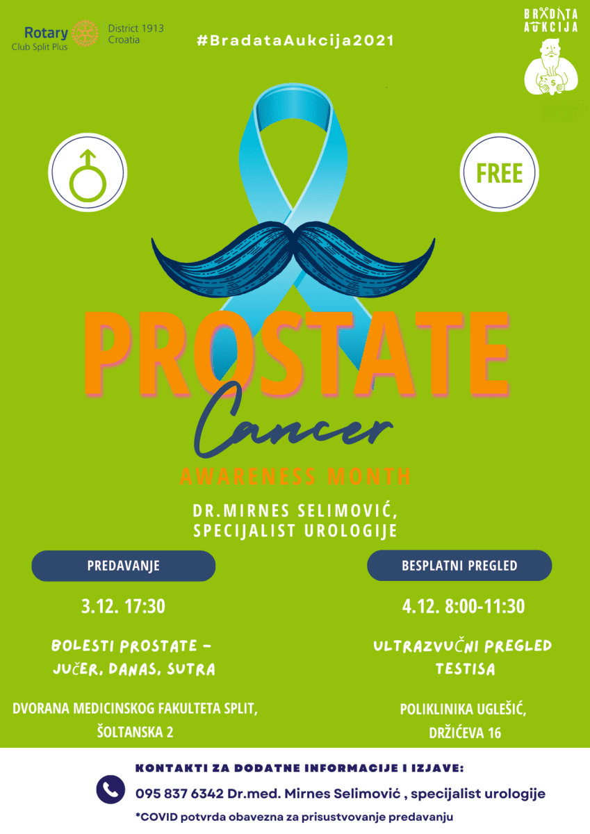 Ovogodišnje izdanje BRADATE AUKCIJE oplemenjeno je sa dva nova sadržaja koje provodi Rotary klub Split PLUS, a za cilj ima poticanje javnosti na edukaciju o važnosti preventivnih pregleda. Zahvaljujući dr.med. Mirnesu Selimoviću, specijalistu urologije, organizira se predavanje na Medicinskom fakultetu o bolestima prostate i besplatan ultrazvuk za muškarce.