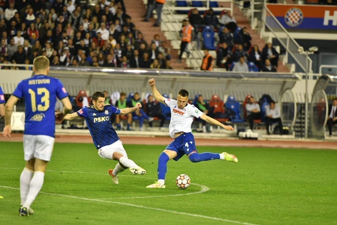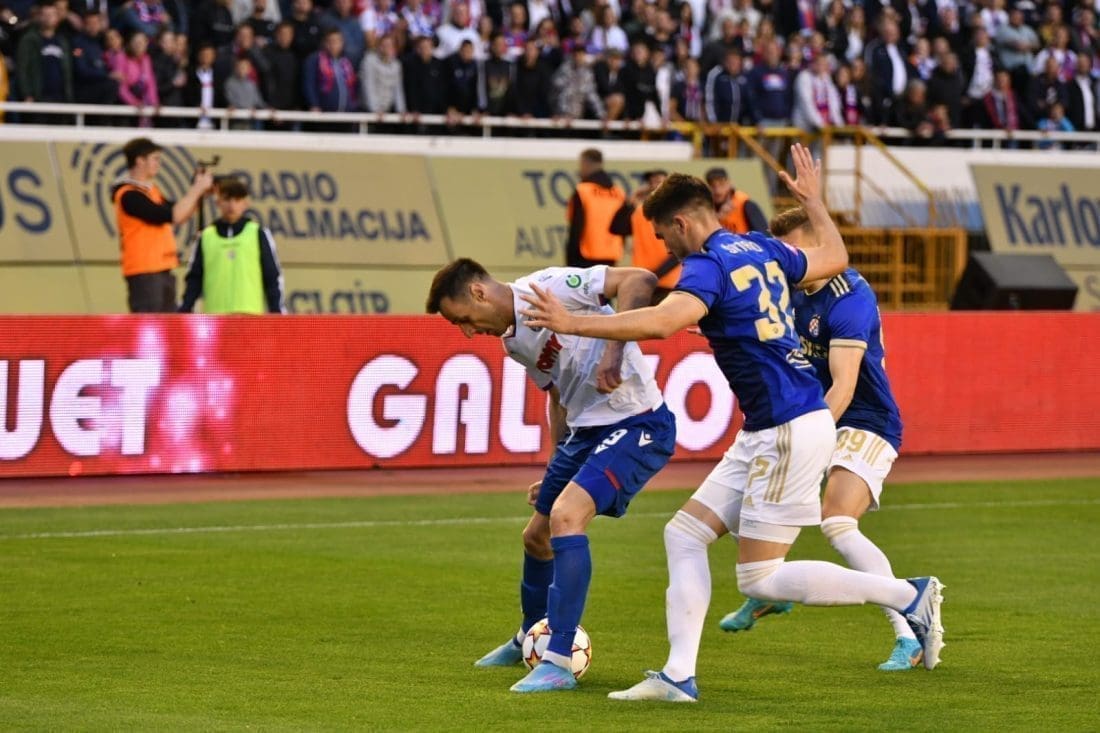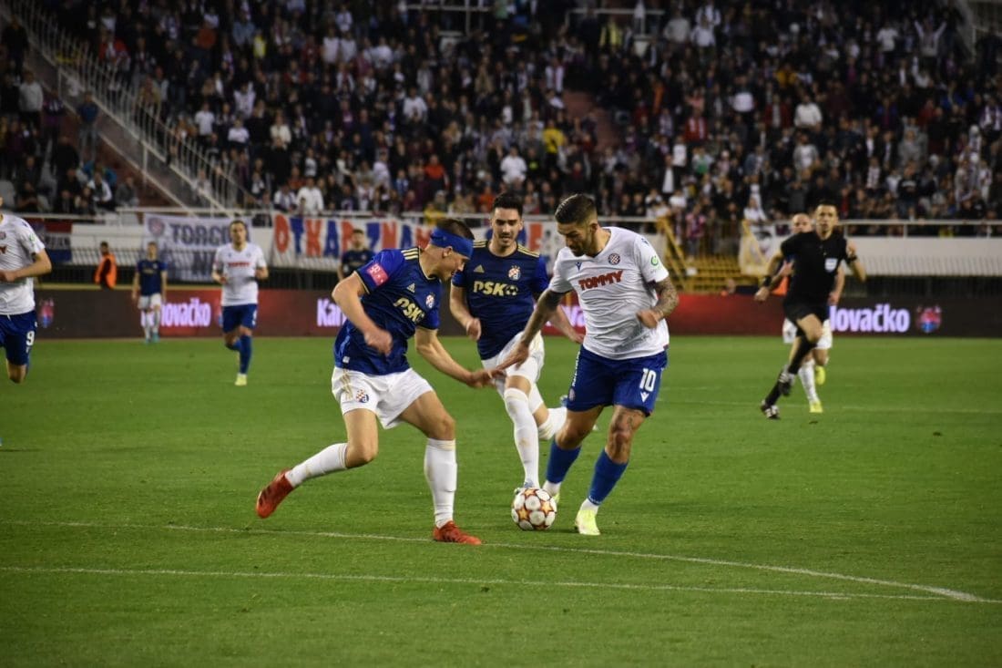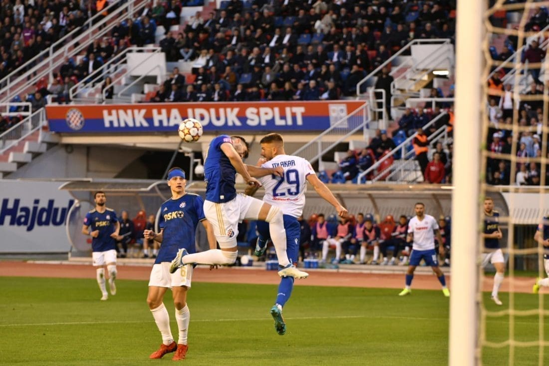 Početak utakmice obilježen je Emrelijevim padom i ležanjem. Kalinić je u 10. minuti izborio prekid u odličnoj poziciji, na 18 metara iskosa, ali Krovinovićev je pokušaj zapeo u bloku. Ristovski je odmjereno ubacio s desne strane u 12. minuti, ali Mikanović se dobro postavio u skoku. Kalinić je u 13. minuti zamalo iznenadio vratara Livakovića uklizavši mu na povratnu loptu pa je Dinamov čuvar mreže morao panično izbacivati. Nakon kornera u 15. minuti Livaković je ipak prvi došao do lopte. Hajdukovci su u 20. minuti signalizirali igranje rukom Ristovskog, sudac Pajač nije se oglasio.